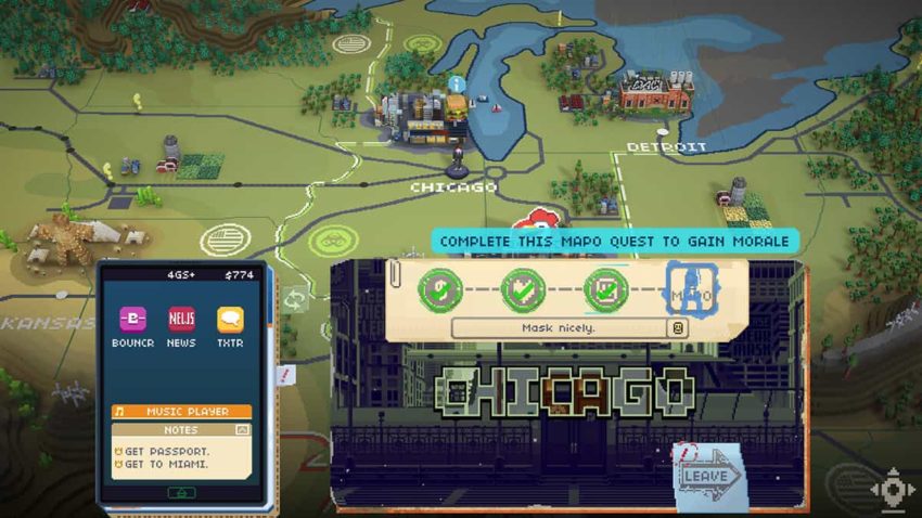As you travel, you lot volition accept to listen your stats. Y'all have 3 stats in the game: health, money, and morale. Health obviously represents your grapheme's well-beingness. If it reaches nada, it'due south game over. Money is needed to travel to your next destination. Lastly, morale impacts your decision-making. The higher morale you have, the more time yous have to make a choice during a timed section. Keeping all three of these stats loftier is crucial. Thankfully, a secret grouping called MapO is here to help you lot with that. At every location you visit, y'all'll be assigned three missions. Before you get out for your next destination, if y'all completed any of those missions, yous will be awarded either wellness, money, or morale.